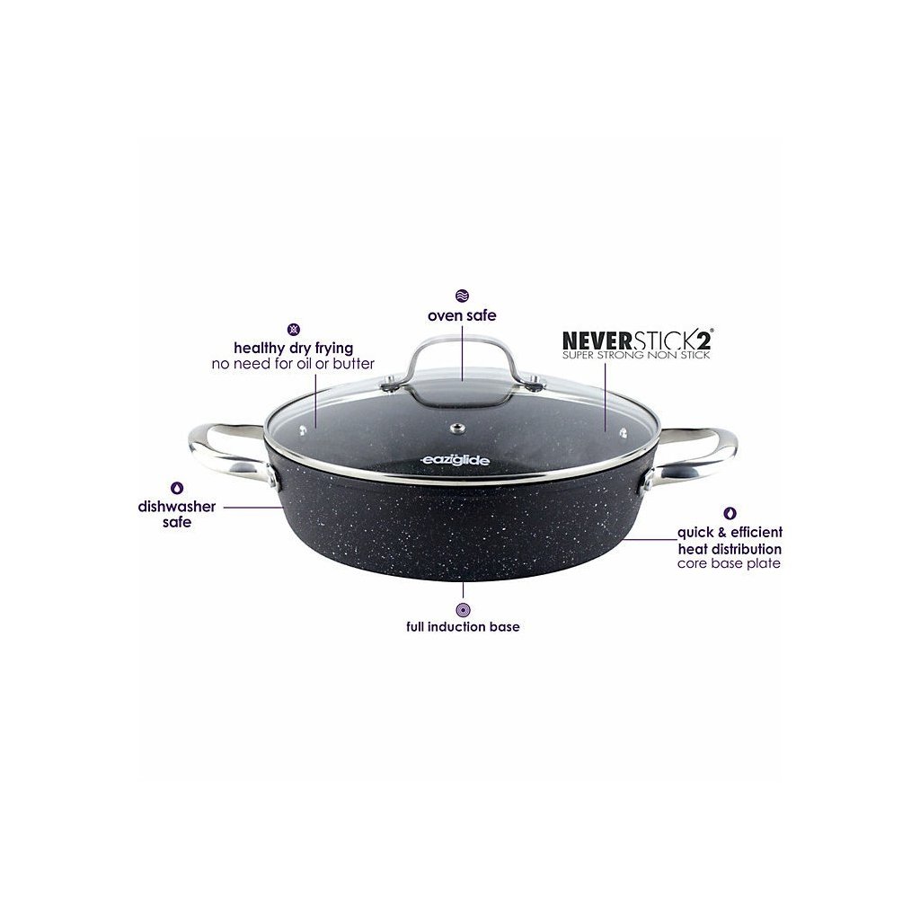 Neverstick2-keittoastiat Eaziglide edustavat viimeisintä teknologiaa ja vallankumouksellisia innovaatioita tarttumattomien keittoastioiden alalla. Eaziglide Karkaistusta alumiinista valmistettu Neverstick2 on suunniteltu erityisesti helpottamaan elämääsi. Yksinomainen Neverstick2-pinta kestää paljon kauemmin kuin muut pinnat ja käyttää 7 kertaa vahvempaa teknologiaa, joten voit valmistaa ruokaa terveellisesti ilman öljyä tai muita rasvoja.