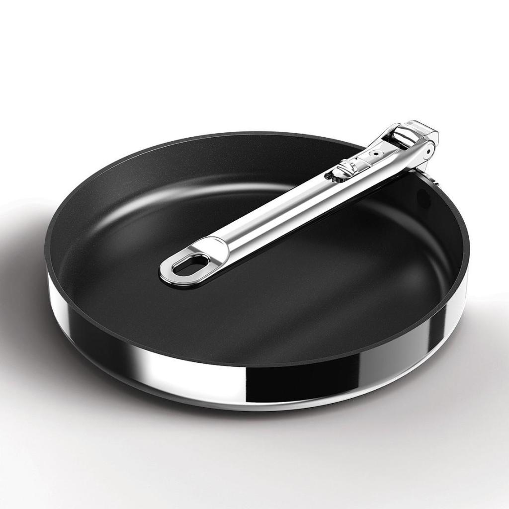 - Taittomekanismin ansiosta saman sarjan pannuja voidaan pinota laatikoihin tai kaappeihin, säästäen jopa 50 % tilaa.