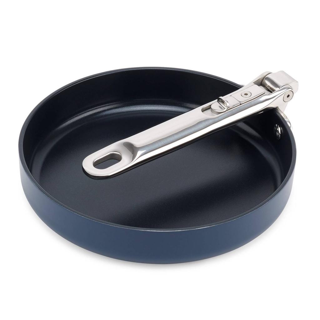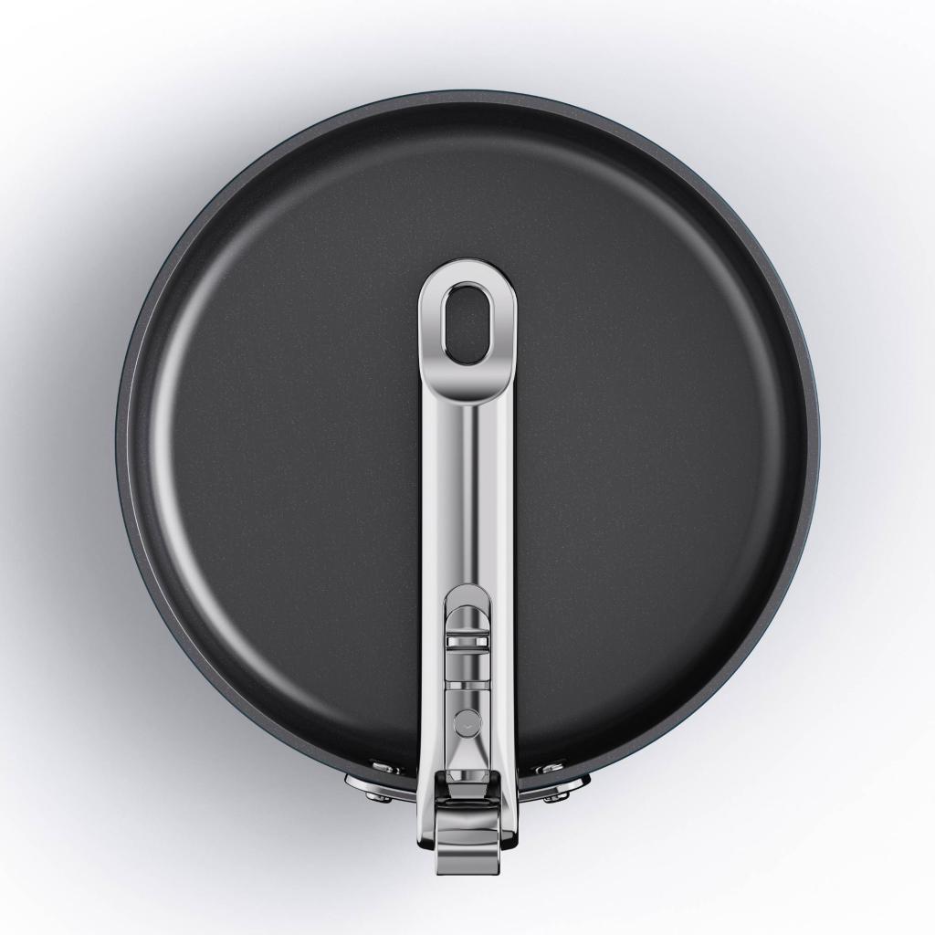 - Kokoontaitettavan mekanismin ansiosta pannu voidaan pinota helposti muiden astioiden kanssa, mikä helpottaa merkittävästi keittiötilan järjestämistä.