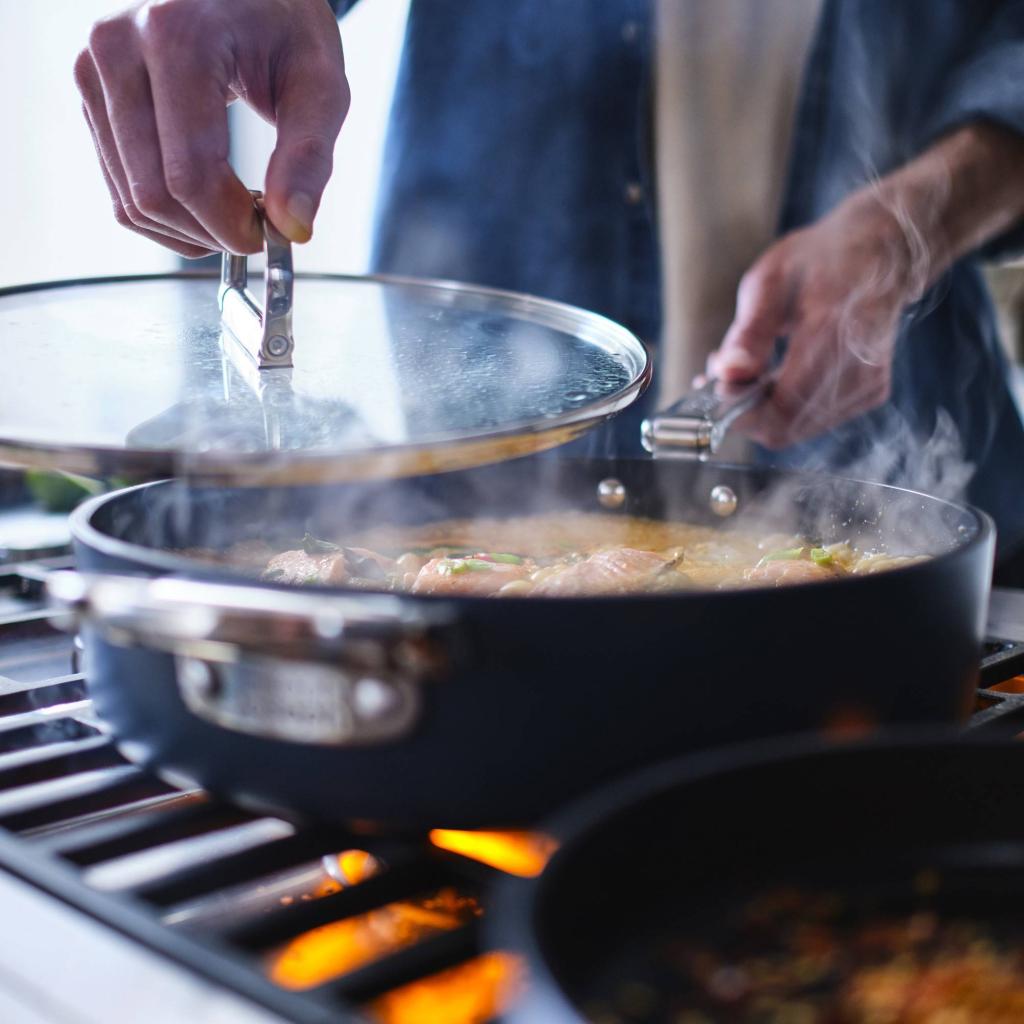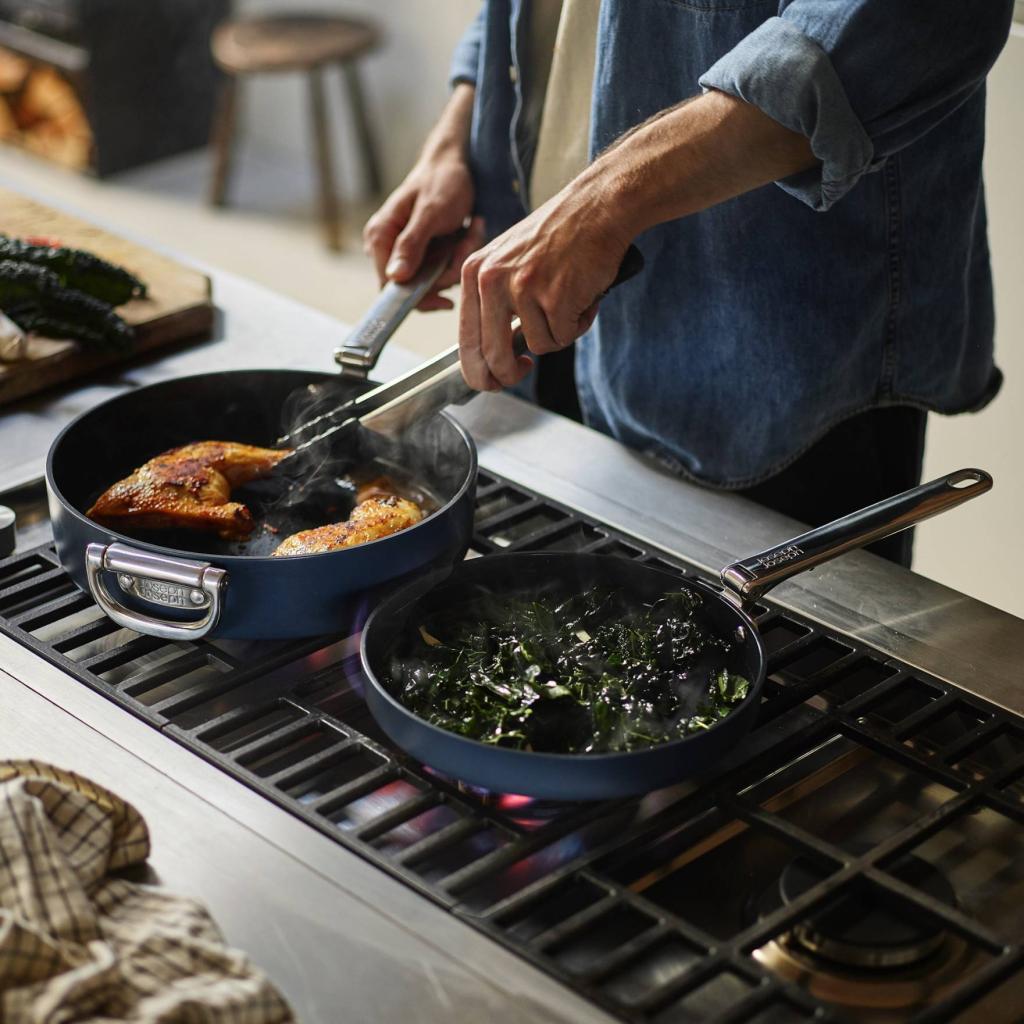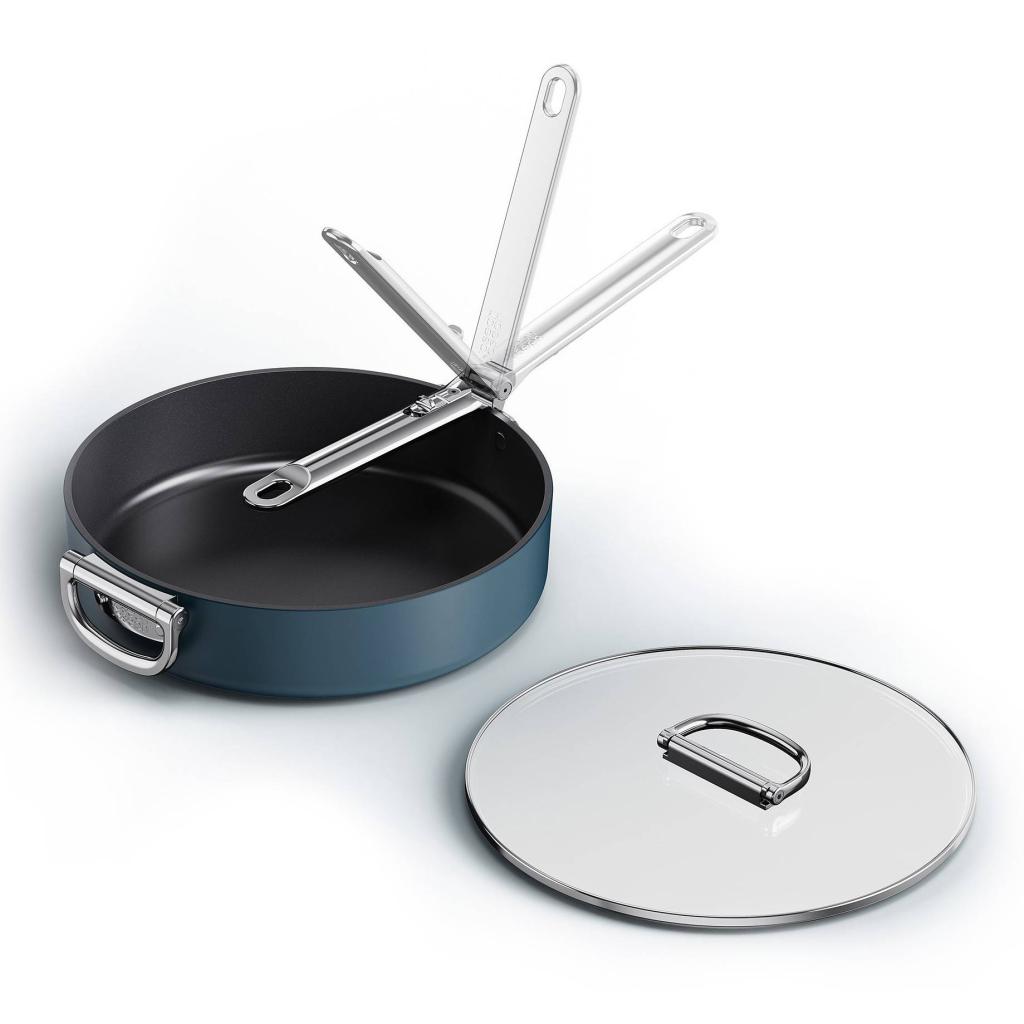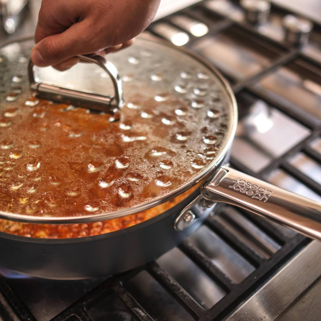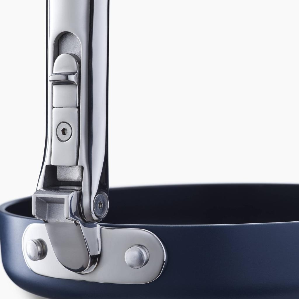 - Kokoontaitettavan mekanismin ansiosta pannu voidaan pinota helposti muiden astioiden kanssa, mikä helpottaa merkittävästi keittiön kaappien järjestystä.