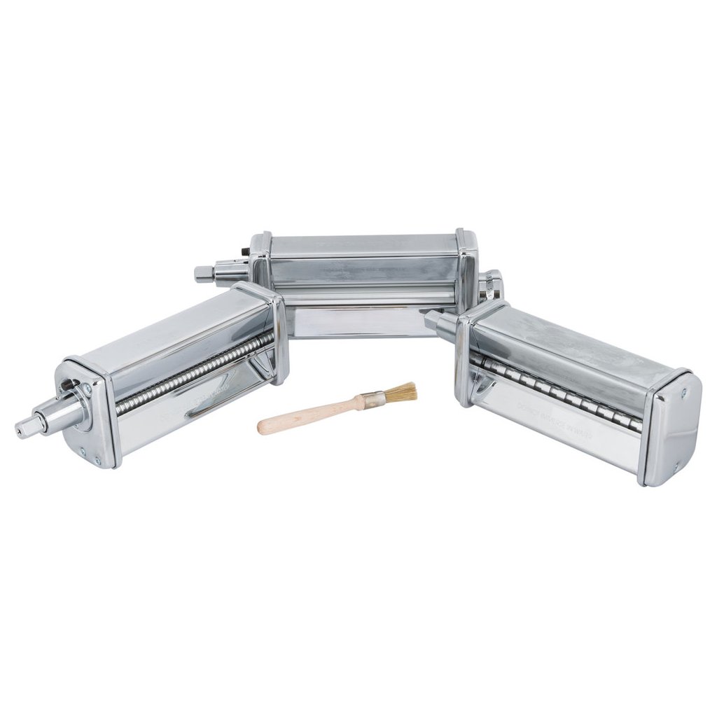 Kolmen pastakoneen setti KitchenAid Kestävästä kromatusta metallista valmistettu setti tagliatellejen, spagettien tai pastalevyjen nopeaan valmistukseen esimerkiksi lasagnea varten. Sarja on lisävaruste roboteille: