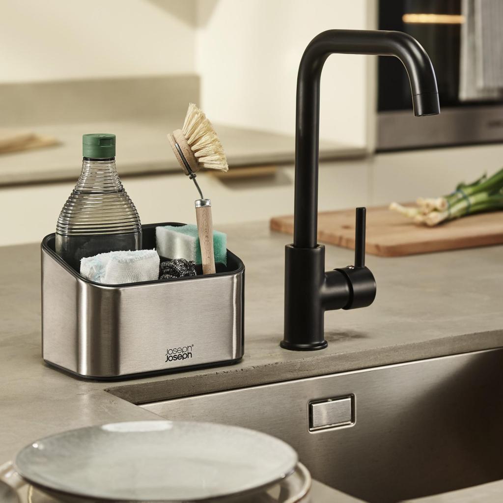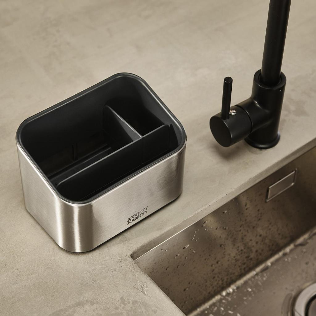 Joskus tuntuu, että tiskialtaan äärellä on kuin pienessä laboratoriossa täynnä sienet, harjat ja pullot, jotka ovat tiellä toisilleen. Tämä ruostumattomasta teräksestä valmistettu järjestäjä tuo niille selkeän järjestyksen ja erottaa yksittäiset apuvälineet niin, että jokaisella on oma paikkansa. Improvisaation sijaan tulee yksinkertainen järjestelmä, joka toimii joka päivä.
