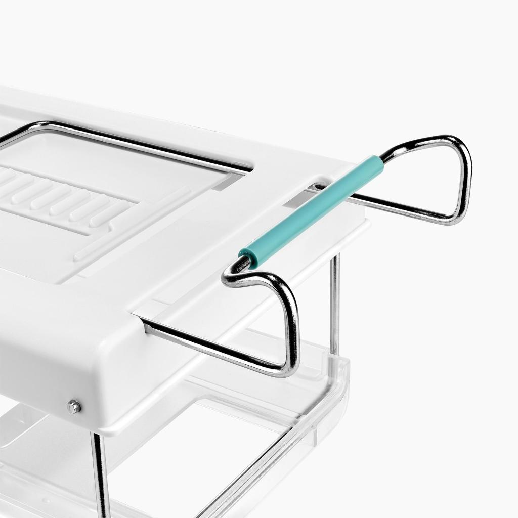 - Valmistettu kestävästä muovista ja metallielementeistä, suunniteltu pitkäaikaiseen käyttöön jääkaapissa ja helppoon puhdistukseen pyyhkimällä.