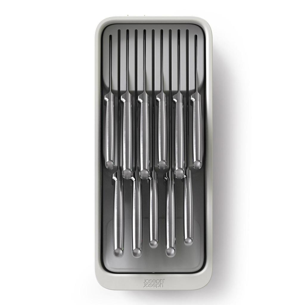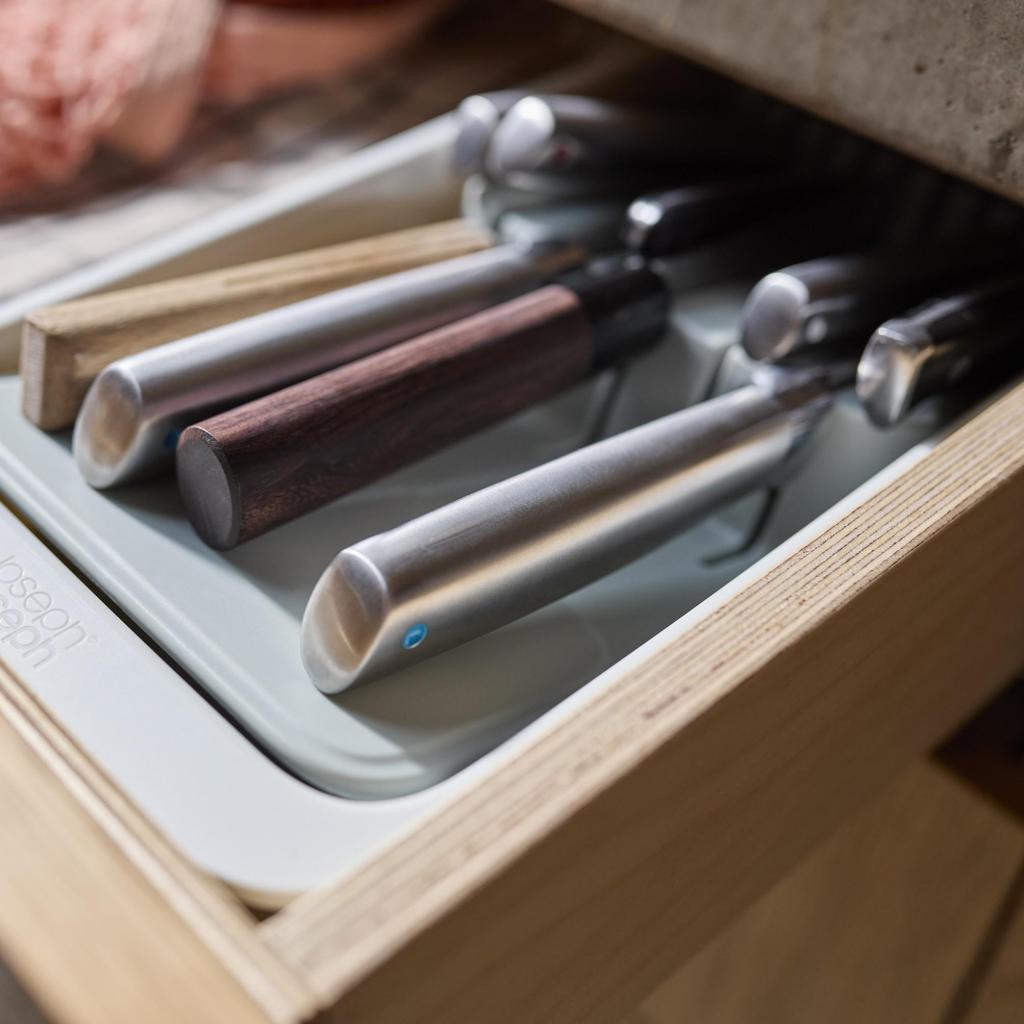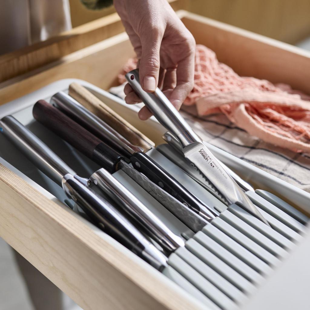 - Kompakti Joseph Joseph DRAWERSTORE-veitsijärjestelijä mahdollistaa keittiöveitsien turvallisen säilytyksen suoraan laatikossa.