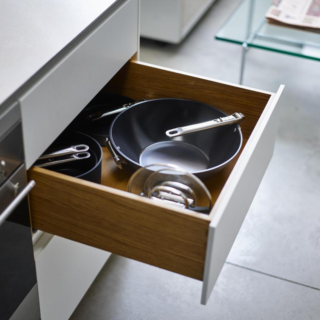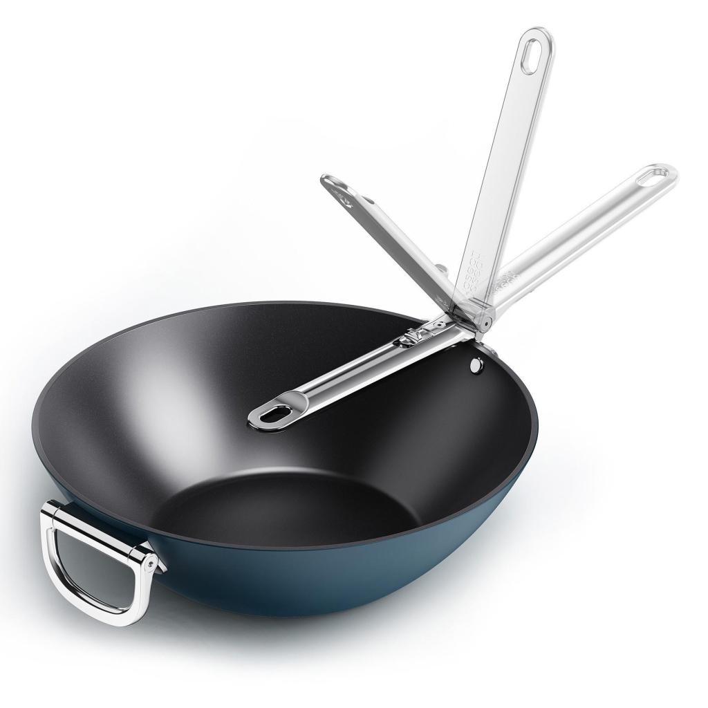 - Säilytysmekanismin ansiosta kahva voidaan helposti taittaa vokkipannun vartta pitkin, mikä säästää jopa viisikymmentä prosenttia tilaa verrattuna tavallisiin astioihin.
