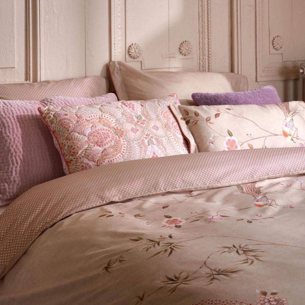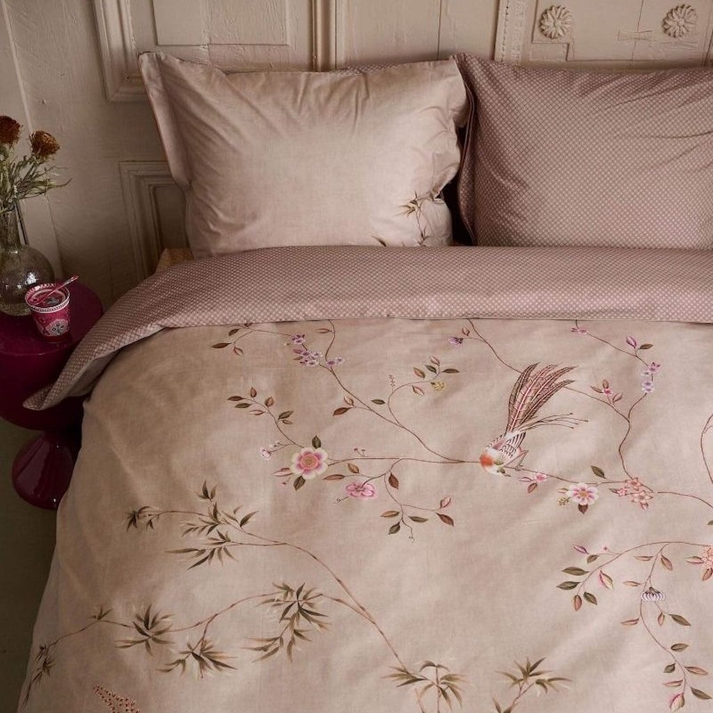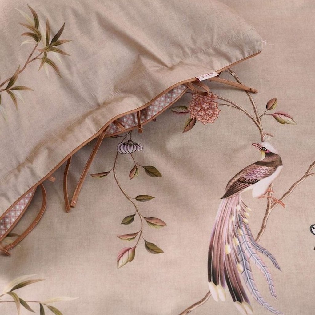 - vuodevaatteiden kuvio on koristeltu herkillä kukkakuvioilla, bambunversoilla ja linnuilla pehmeällä hiekkapohjaisella pohjalla