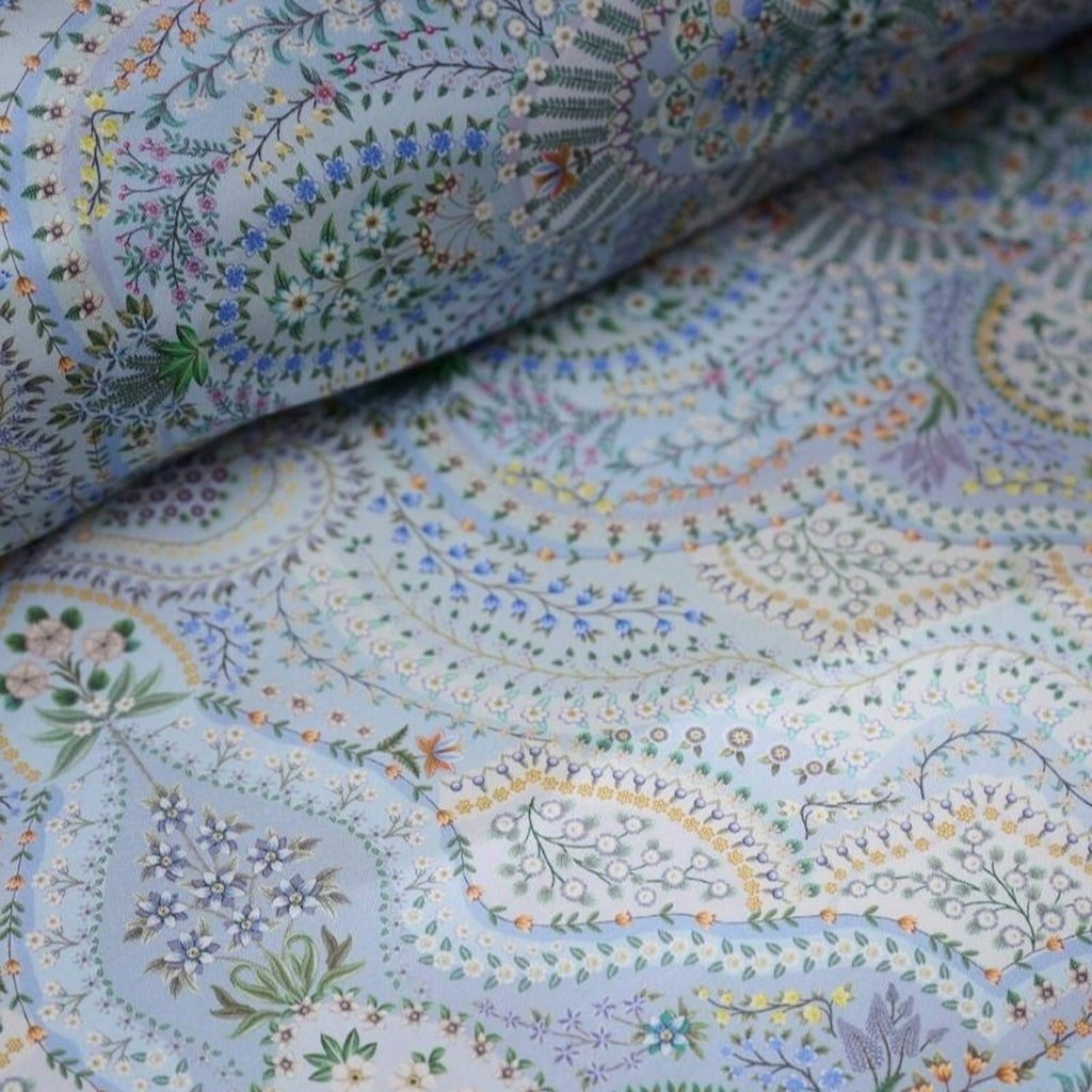 - etupuolta koristavat yksityiskohtaiset kukka- ja lehtikuviot pehmeissä pastellisävyissä vaaleansinisellä pohjalla