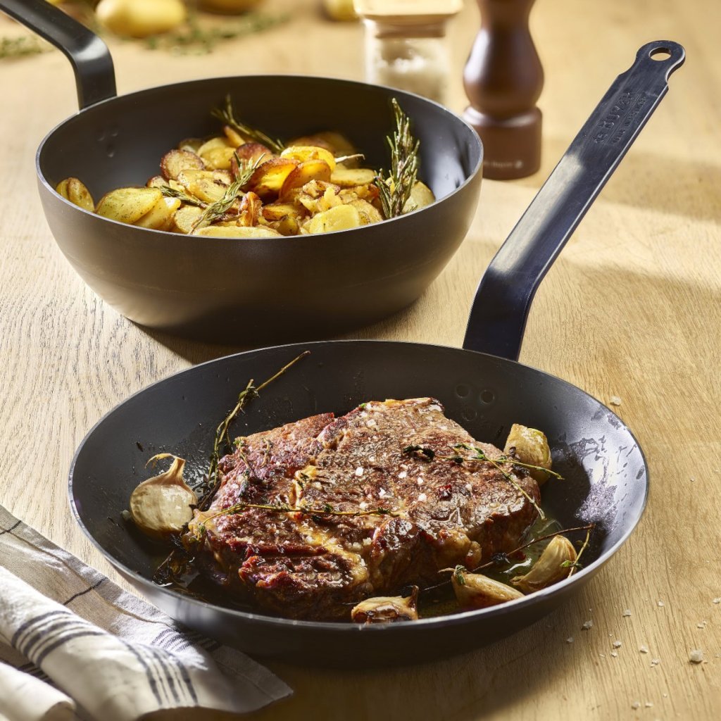 - yhdistää 2 mm paksun hiiliteräksen erinomaisen lämmönjohtavuuden ja ainutlaatuisen sinisen lämpökäsittelyn, joka lisää kestävyyttä ja hapettumiskestävyyttä